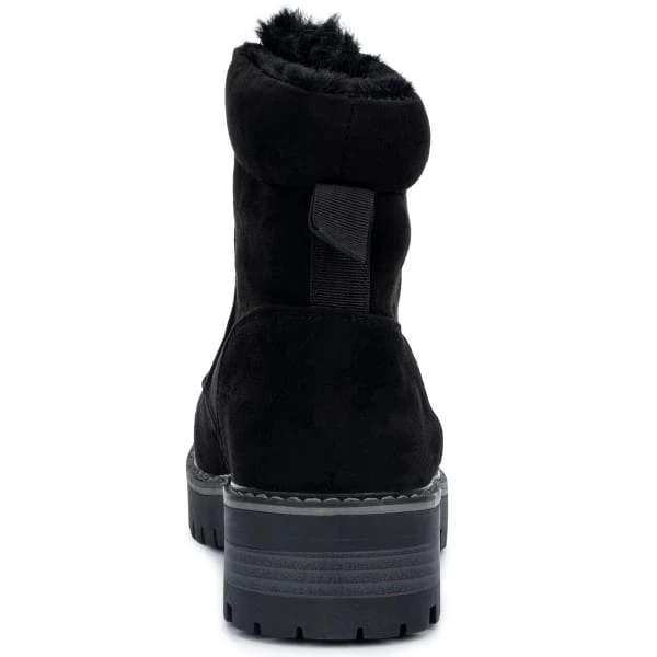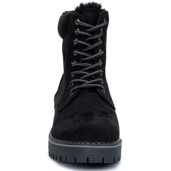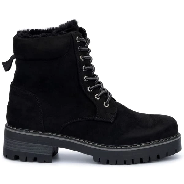 Comfort and glamourous style meet in the cool look of these velvety combat-style boots. Inside the collar is a soft faux-fur trim for added comfort.