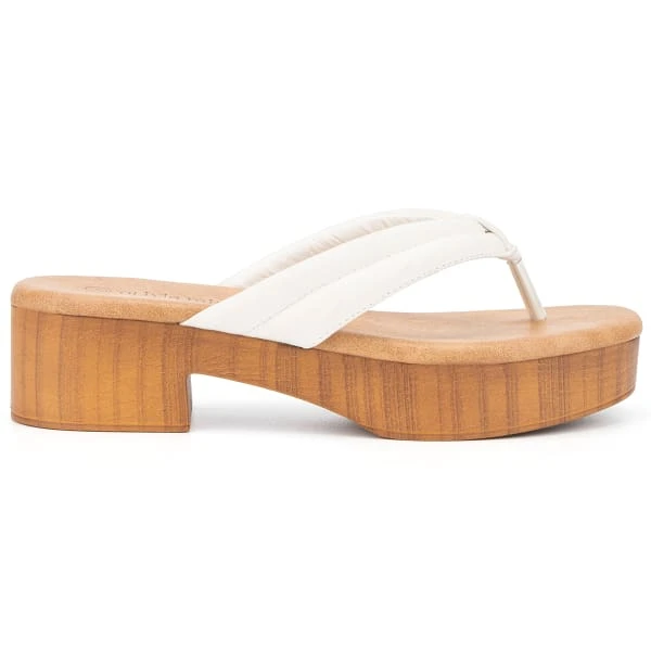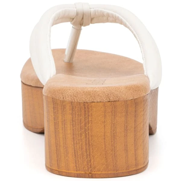 - Slide-on sandal with wood block sole.