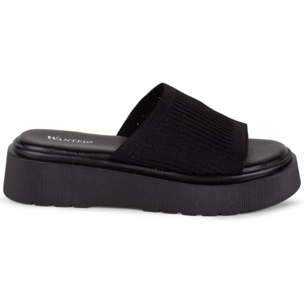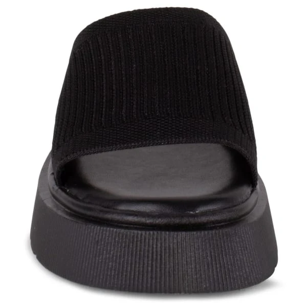 - Platform slide sandal with stretch knit upper.